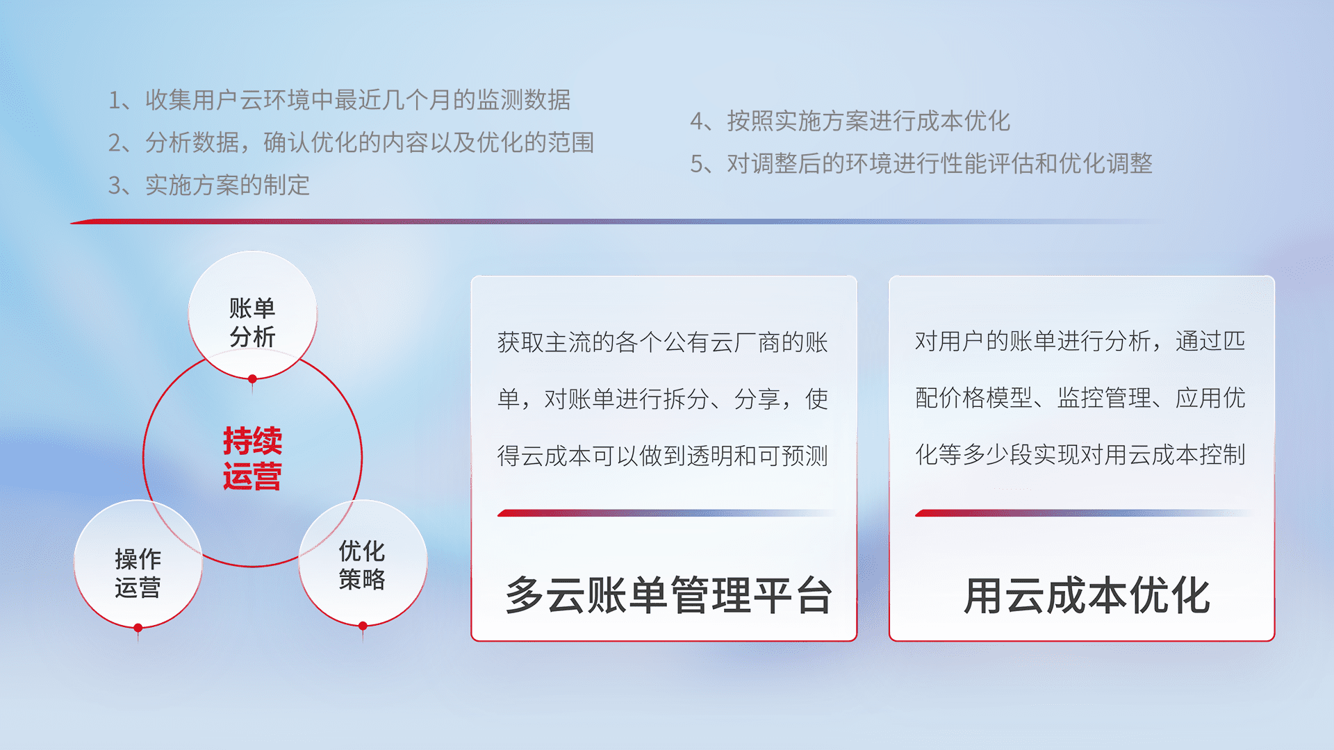 通过多云纳管,,,,以统一的资源数据模型把客户的云资源进行抽象和封装,,进而实现对多云资源的统一操作,,,保障云资源管理的可靠性、、稳定性与可用性。。。量身定制化运维内容,,,配置、、、开发运维、、补丁管理、、备份、、、监控、、认证和访问管理、、审计和日常巡检等,,,,保障在用云过程中的可靠度,,稳定度以及高可用率。。。